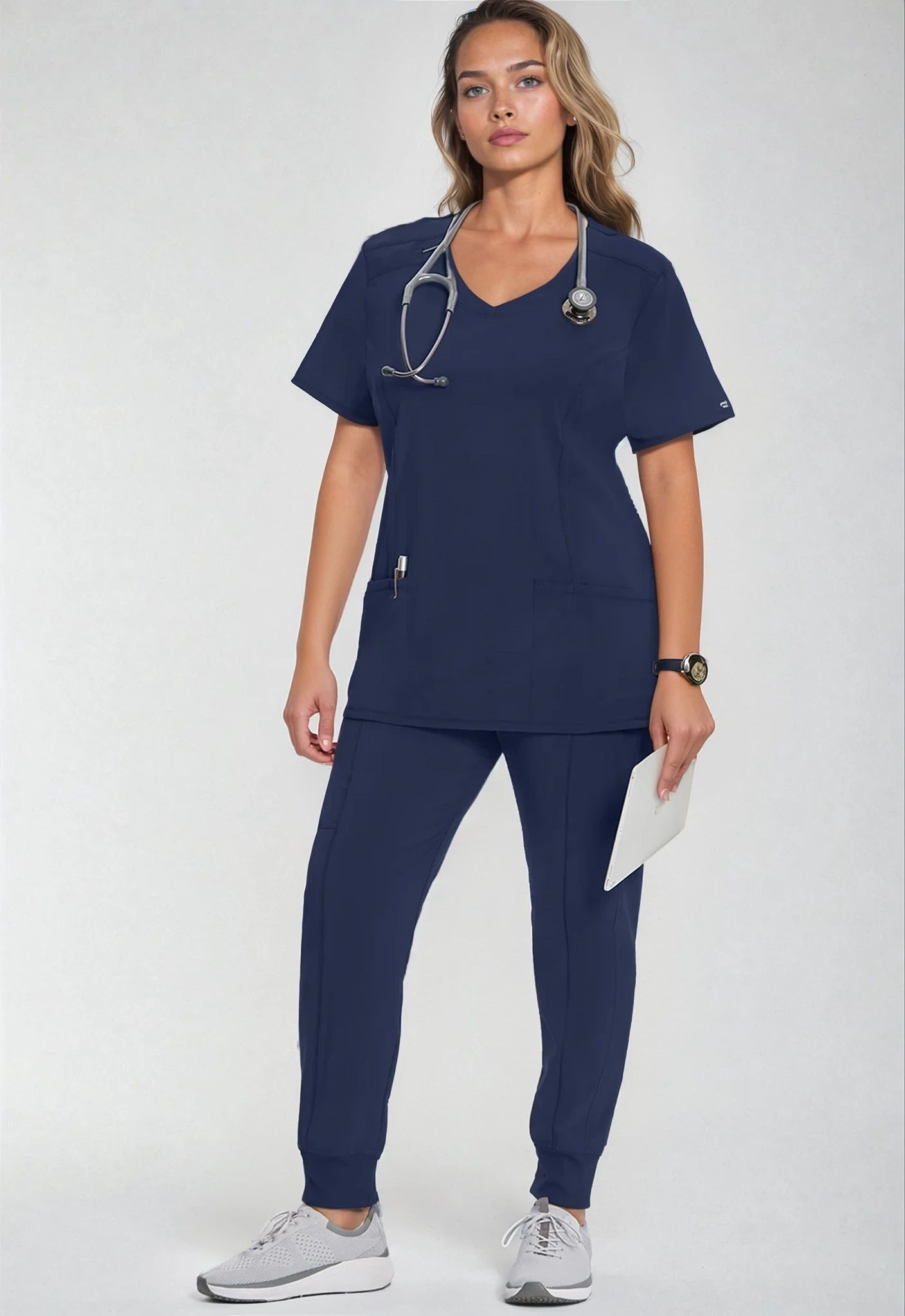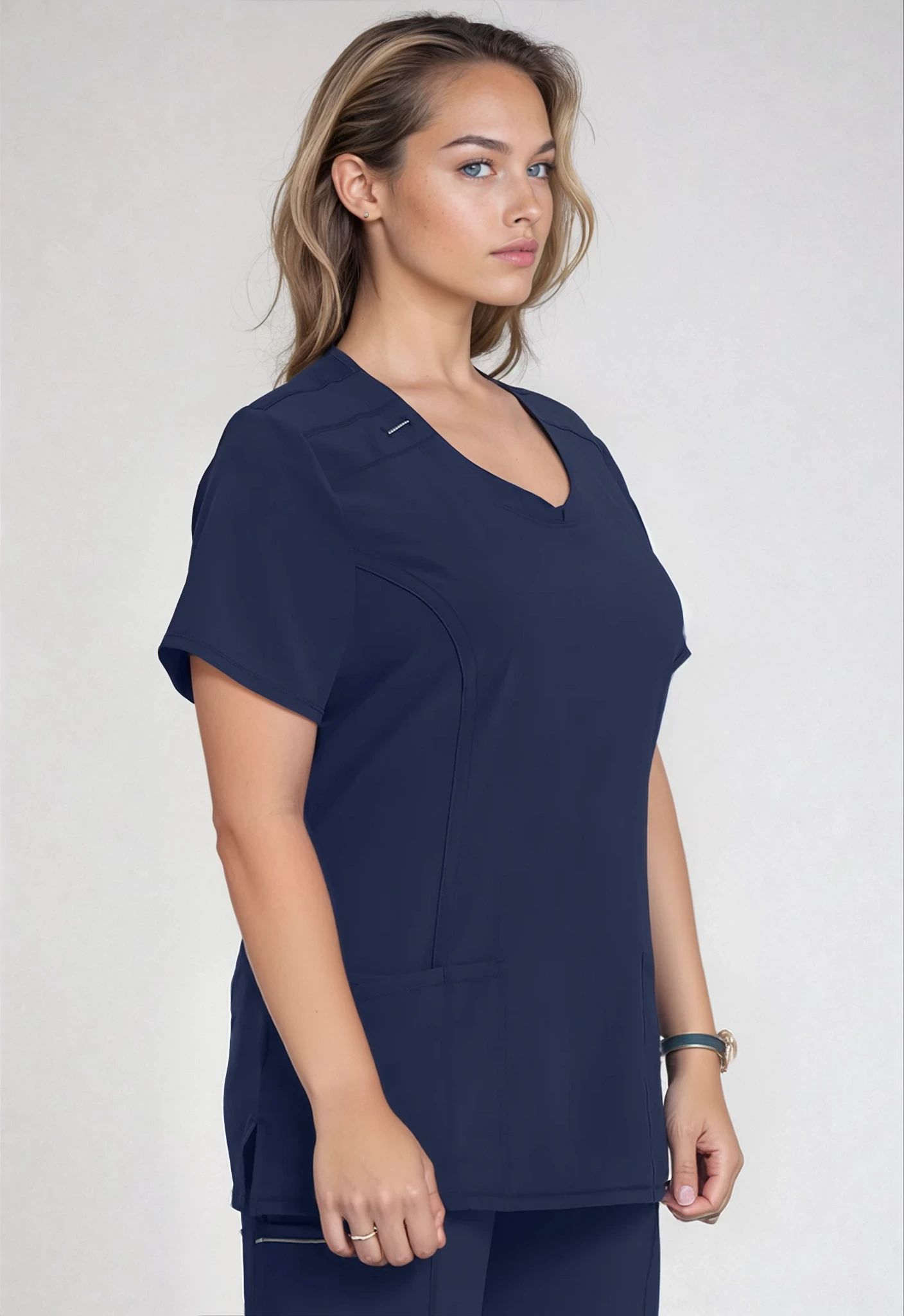 Bluzka medyczna o nowoczesnym kroju z okrągłym dekoltem i wstawką z dzianiny prążkowanej przy dekolcie. Posiada karczki na ramionach, pętelkę na identyfikator na prawym ramieniu, zaszewki z przodu i z tyłu, dwie kieszenie naszywane, jedną wewnętrzną kieszeń oraz rozcięcia po bokach. Wstawka z dzianiny prążkowanej na środku tylnego panelu nadaje bluzce wyszczuplający kształt i zapewnia dodatkową swobodę ruchów oraz komfort użytkowania dzięki użytej nowoczesnej technologii ograniczającej pocenie się. Całość wykończona jest szwami ozdobnymi. Komfortowa tkanina z dodatkiem elastanu oraz super elastyczna dzianina prążkowana to idealne połączenie dla profesjonalistów w służbie zdrowia.