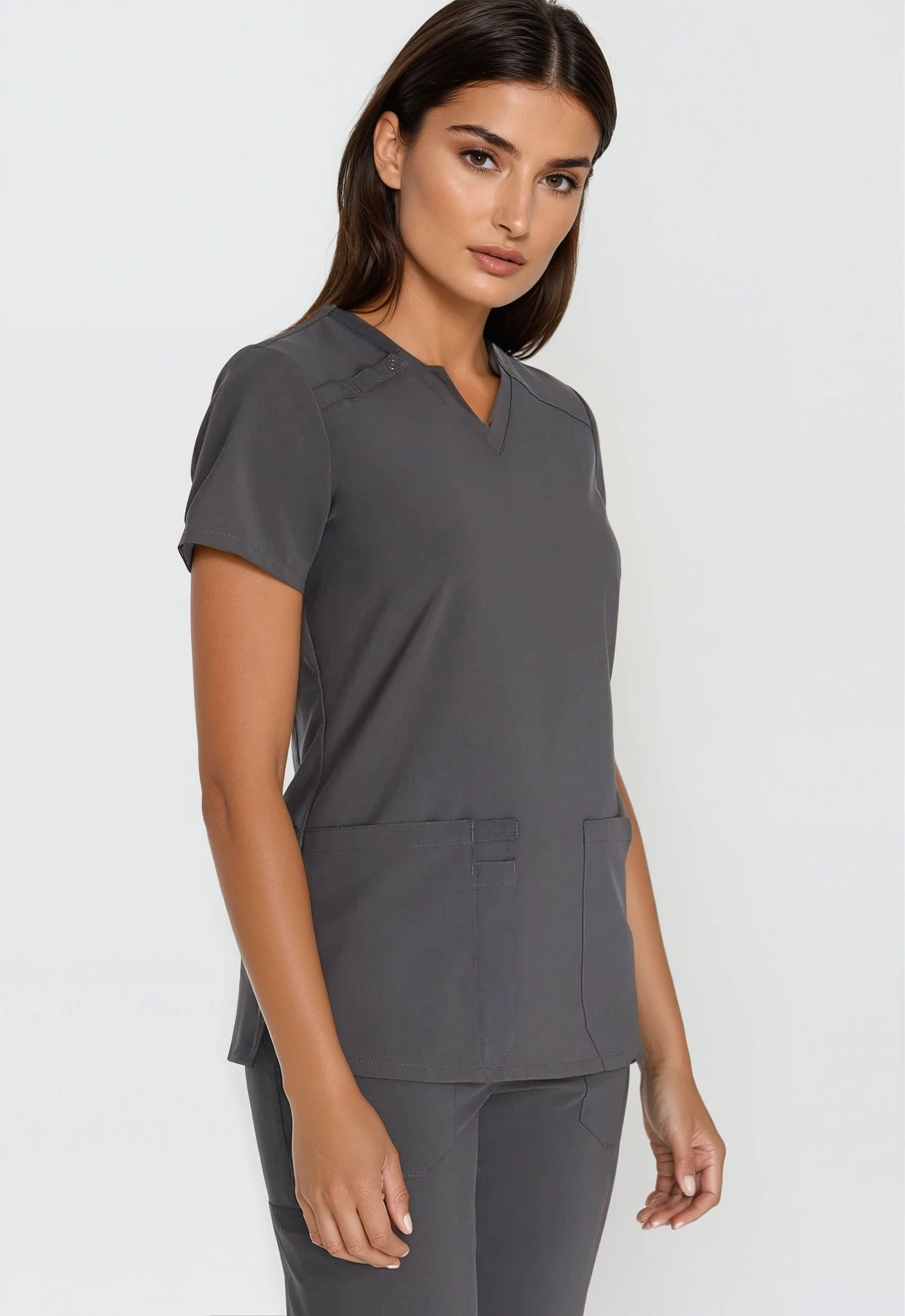 Bluzka medyczna o nowoczesnym kroju z dekoltem w serek, posiada dwie naszywane kieszenie oraz kieszonkę na długopis. Dodatkowo, bluzka ma charakterystyczną tonalną metkę, taśmę użytkową oraz logo na taśmie przy dekolcie. Długość środka pleców: 66 cm.