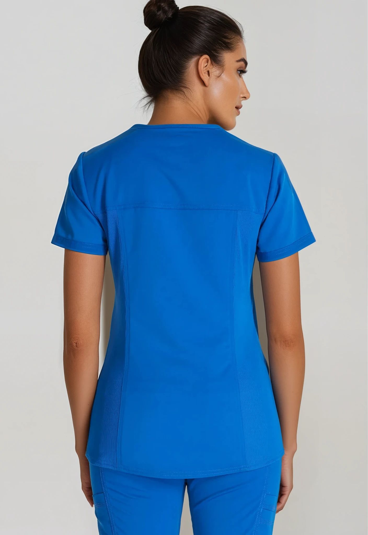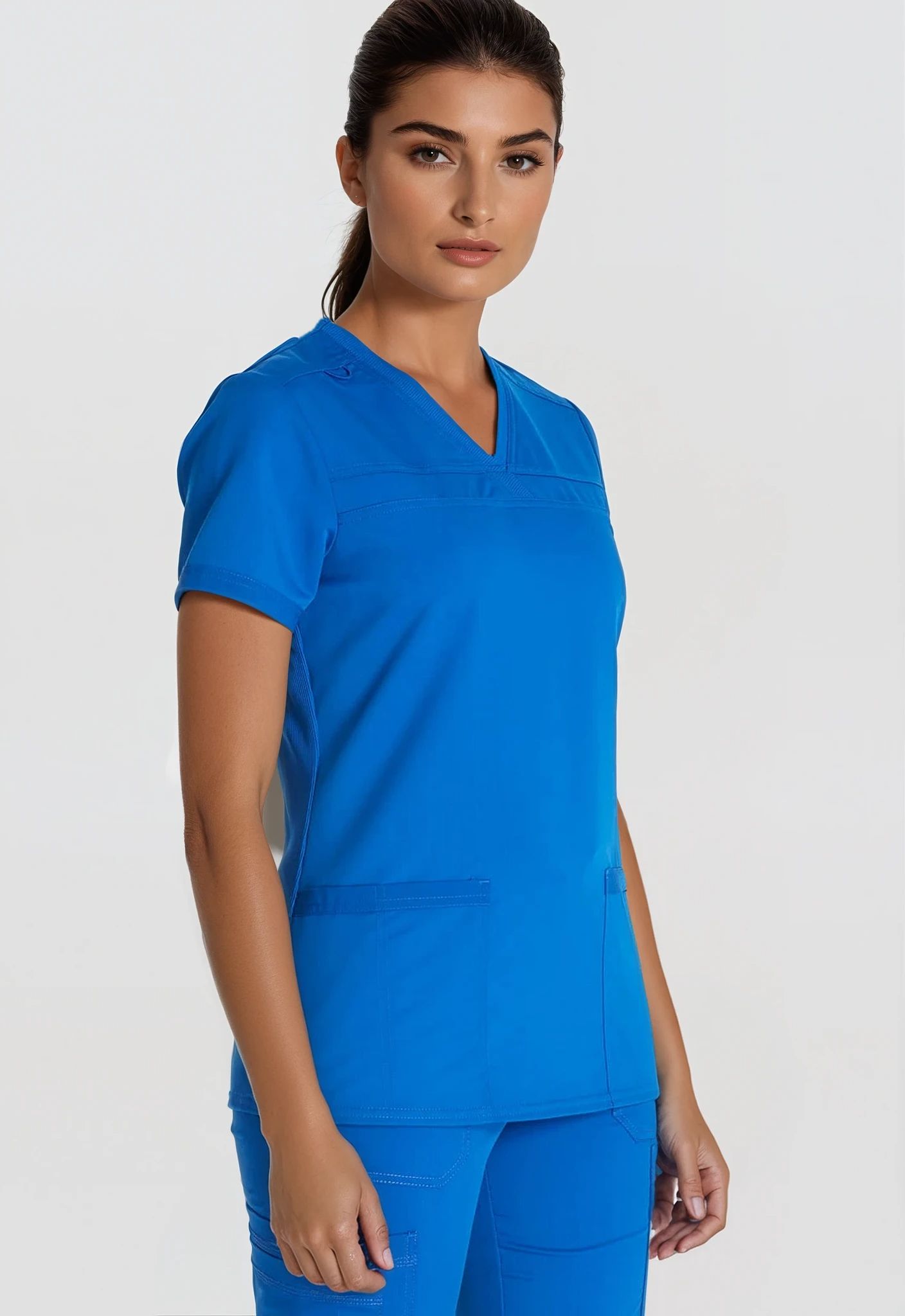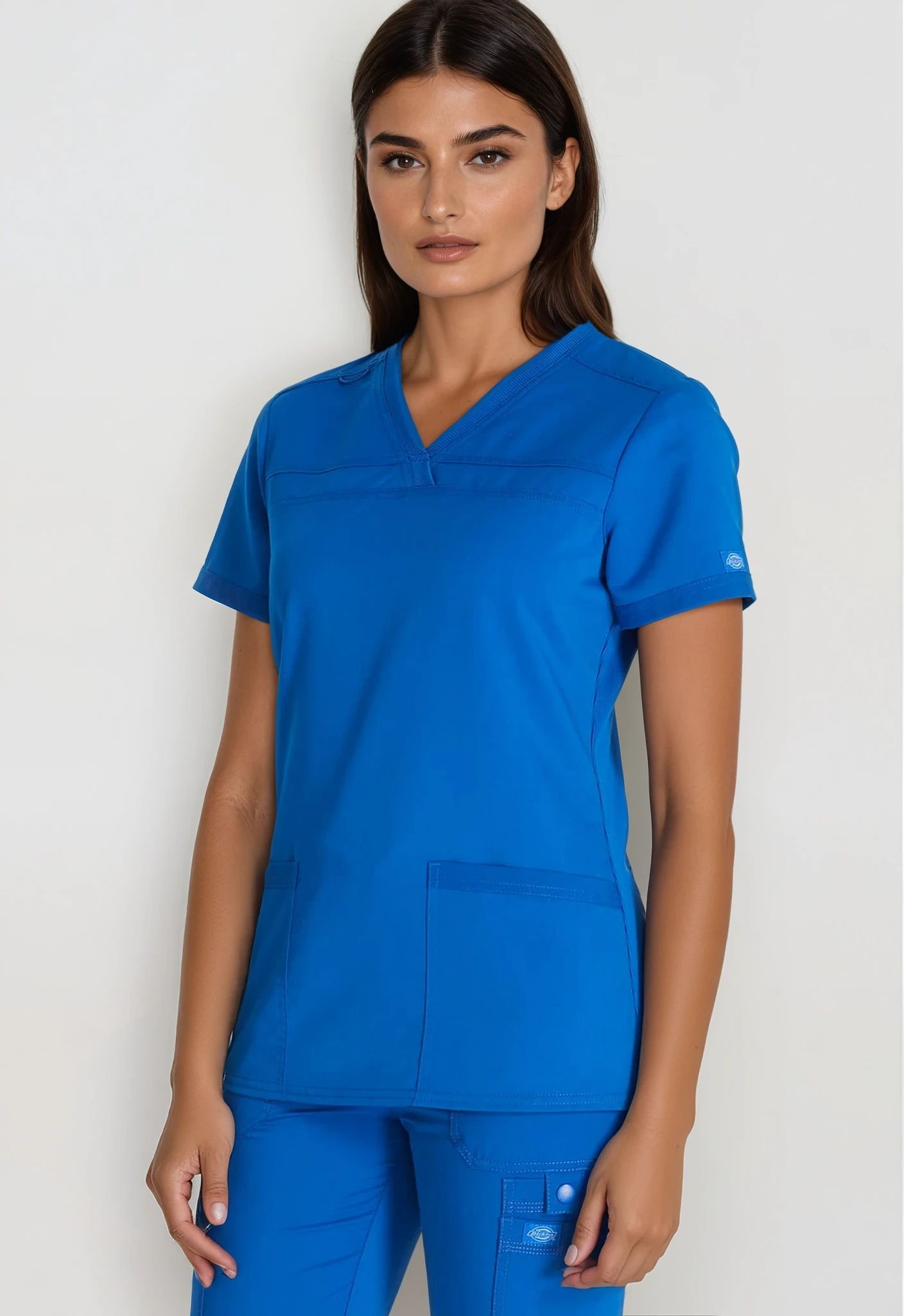 Stylowa bluzka medyczna z dekoltem w serek, posiada dzianinowy kołnierz, dwie naszywane kieszenie z przodu, panele z dzianiny prążkowanej z tyłu dla komfortu oraz lekko zaokrąglony dół. Pętelka na identyfikator dodana na prawym karczku, tonalna metka Dickies na lewym rękawie. Nowoczesny krój. Długość środka pleców: 69 cm.