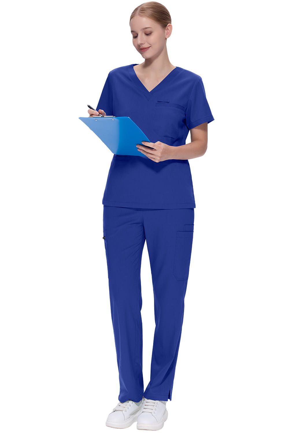 Spodnie medyczne mają średni stan i są regulowane troczkiem w pasie. Proste nogawki zapewniają stylowy wygląd bez rezygnacji ze swobody ruchów i wygody podczas pracy. Kieszenie na obu nogawkach pozwalają na łatwy i szybki dostęp do podręcznych przedmiotów, to praktyczny element spodni, który doceni każda użytkowniczka. Wykorzystany materiał jest elastyczny (rozciągliwy w 4 kierunkach), wytrzymały (nie traci koloru nawet po wielokrotnym praniu) i zapewnia wygodę noszenia bez obniżenia trwałości całego kompletu medycznego. Bluzka medyczna posiada także praktyczne kieszenie i jest wyposażona dodatkowo w tasiemkę, do której można przymocować np. identyfikator.