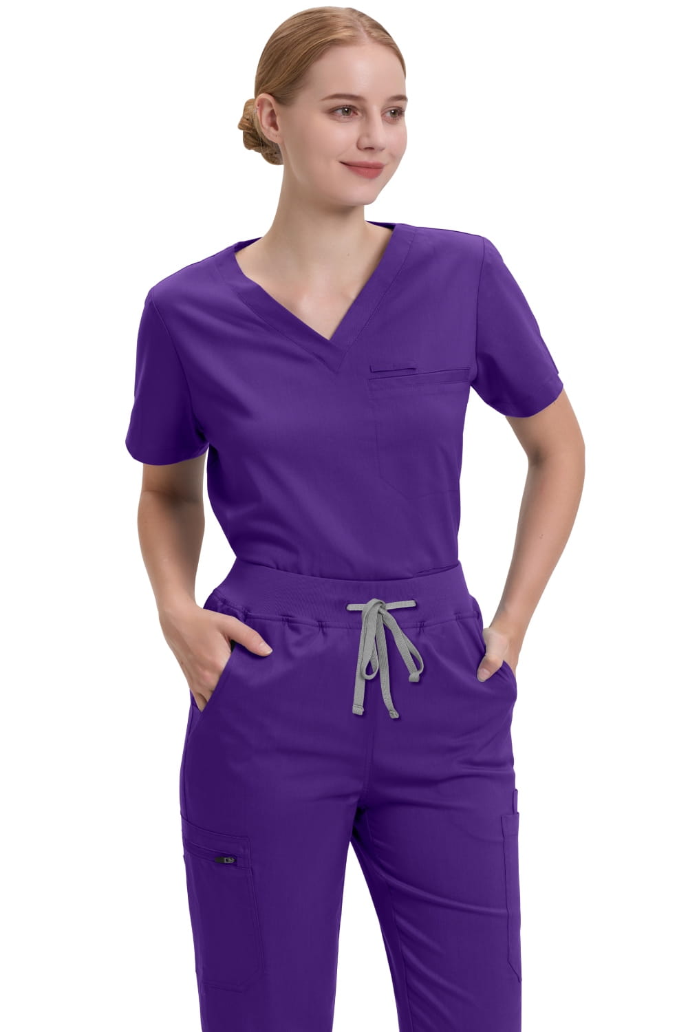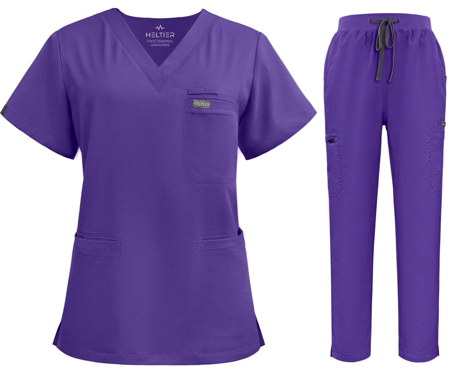 Spodnie medyczne mają średni stan i są regulowane troczkiem w pasie. Proste nogawki zapewniają stylowy wygląd bez rezygnacji ze swobody ruchów i wygody podczas pracy. Kieszenie na obu nogawkach pozwalają na łatwy i szybki dostęp do podręcznych przedmiotów, to praktyczny element spodni, który doceni każda użytkowniczka. Wykorzystany materiał jest elastyczny (rozciągliwy w 4 kierunkach), wytrzymały (nie traci koloru nawet po wielokrotnym praniu) i zapewnia wygodę noszenia bez obniżenia trwałości całego kompletu medycznego. Bluzka medyczna posiada także praktyczne kieszenie i jest wyposażona dodatkowo w tasiemkę, do której można przymocować np. identyfikator.