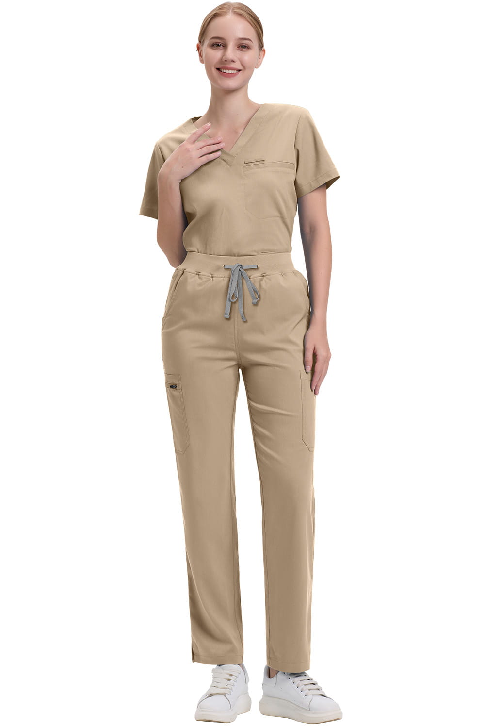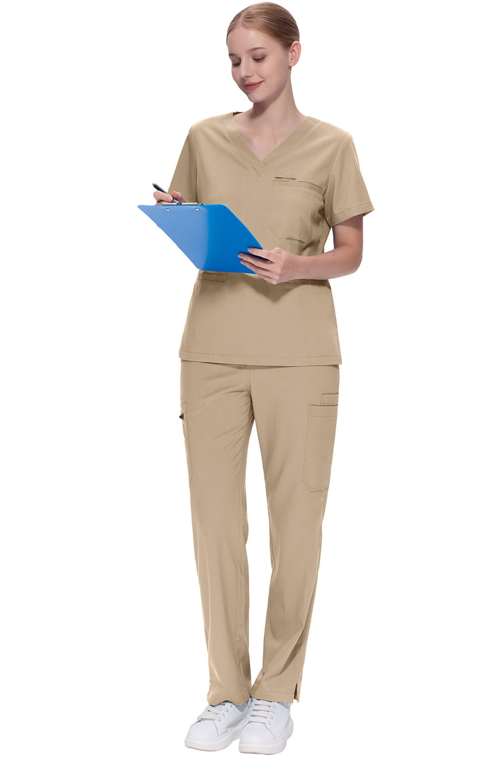 Spodnie medyczne mają średni stan i są regulowane troczkiem w pasie. Proste nogawki zapewniają stylowy wygląd bez rezygnacji ze swobody ruchów i wygody podczas pracy. Kieszenie na obu nogawkach pozwalają na łatwy i szybki dostęp do podręcznych przedmiotów, to praktyczny element spodni, który doceni każda użytkowniczka. Wykorzystany materiał jest elastyczny (rozciągliwy w 4 kierunkach), wytrzymały (nie traci koloru nawet po wielokrotnym praniu) i zapewnia wygodę noszenia bez obniżenia trwałości całego kompletu medycznego. Bluzka medyczna posiada także praktyczne kieszenie i jest wyposażona dodatkowo w tasiemkę, do której można przymocować np. identyfikator.
