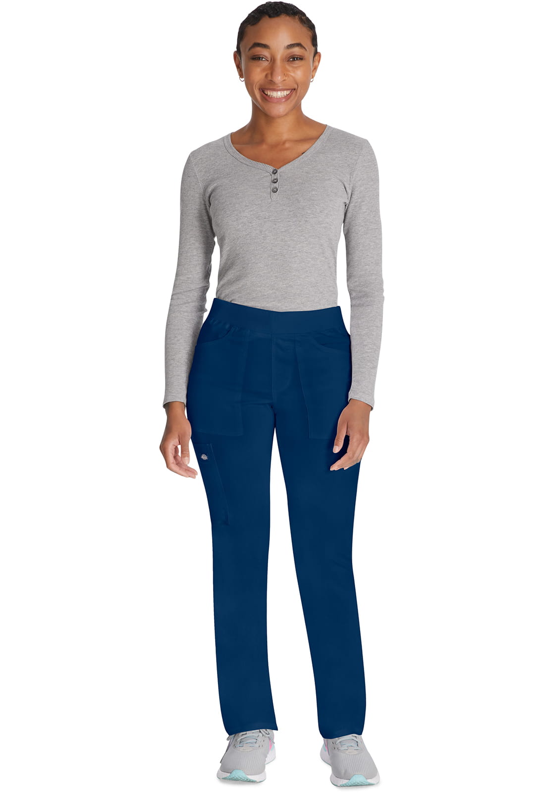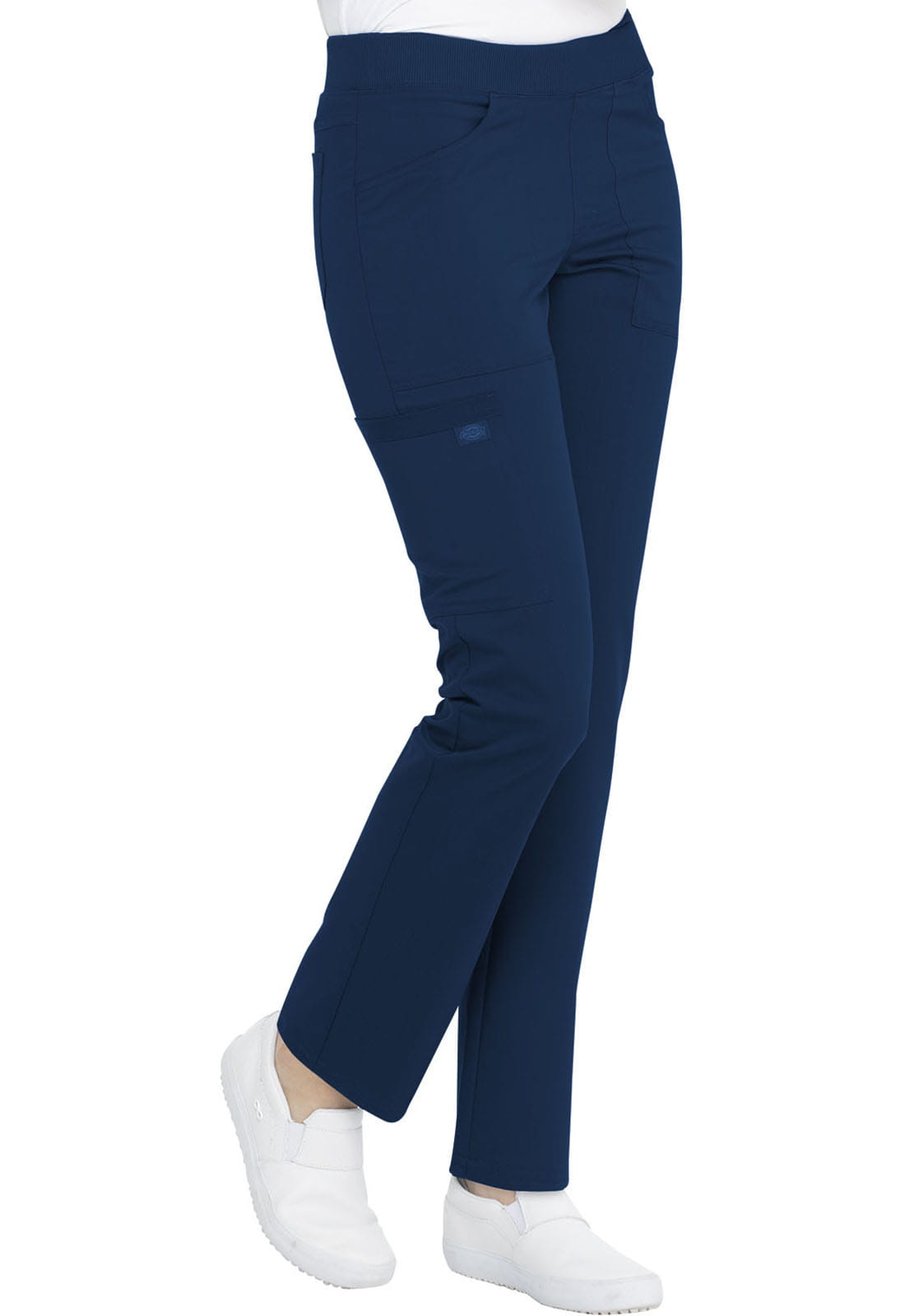 Te wygodne i funkcjonalne spodnie medyczne o średnim stanie i zwężanych nogawkach posiadają dzianinowy pas z wszytą gumką i wewnętrznym sznurkiem dla pełnego wsparcia talii. Spodnie mają liczne kieszenie, w tym dwie kieszenie z przodu, jedną kieszeń cargo, jedną ukrytą kieszeń na zamek oraz dwie kieszenie z tyłu. Dekoracyjna pętla użytkowa po prawej stronie i tonalna metka Dickies dodają charakteru. Nowoczesny krój.
